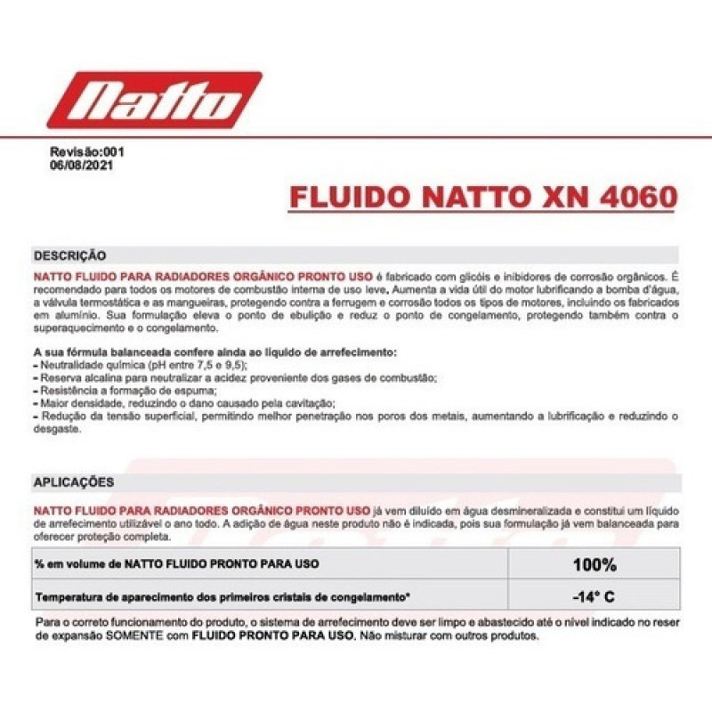 NATTO FLUIDO PARA RADIADORES ORGÂNICO PRONTO USO já vem diluído em água desmineralizada e constitui um líquido de arrefecimento utilizável o ano todo. A adição de água nestre produto não é indicada, pois sua formulação já vem balanceada para oferecer proteção completa.